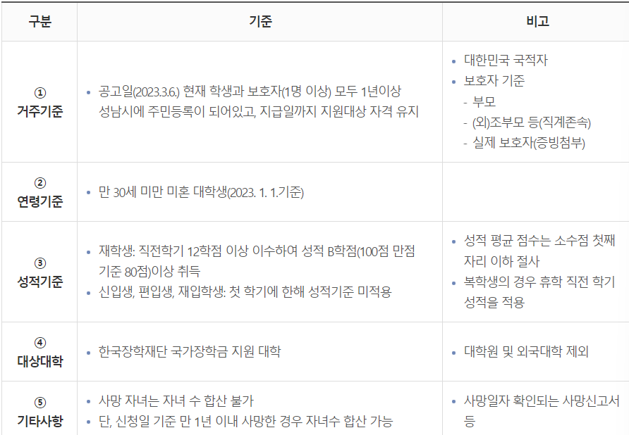 - 다자녀 가구 대학생 등록금 지원대상 : 성남시에 거주하고 있는 다자녀 가구 (자녀 3명 이상) 셋째 이상 미혼 대학생