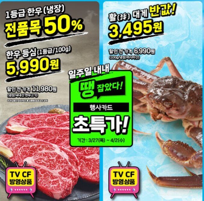 1+1 혜택이 마구 마구 쏟아지고, 거기에 1등급 한우부터 킹크랩까지 50%인데,