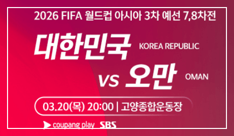SBS : 2025년 3월 20일 (목) 저녁 8시 00분부터 (대한민국 대 오만)