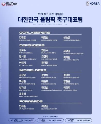 | 2024年 4月 17日 (수) AM 00 : 30 | 대한민국 VS 아랍에미리트 (UAE) |